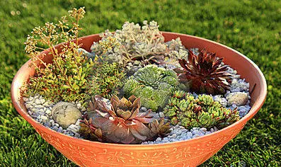 Sempervivums and sedums (shown below) are the best choices for succulents in container gardens – at least for most of us. They are hardy to zones 4 or 5. If you live in milder climates, try aloe, kalanchoe and others. If you want to grow these in colder climates, you will need to bring them in for the winter.